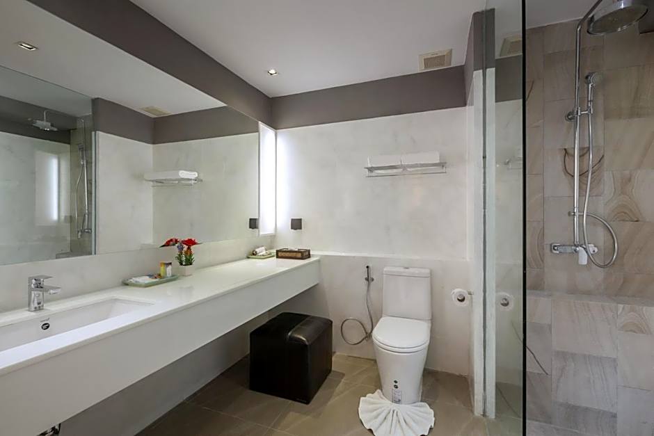The spacious twin/double room provides air conditioning, a tea and coffee maker, a balcony with pool views as well as a private bathroom featuring a shower.